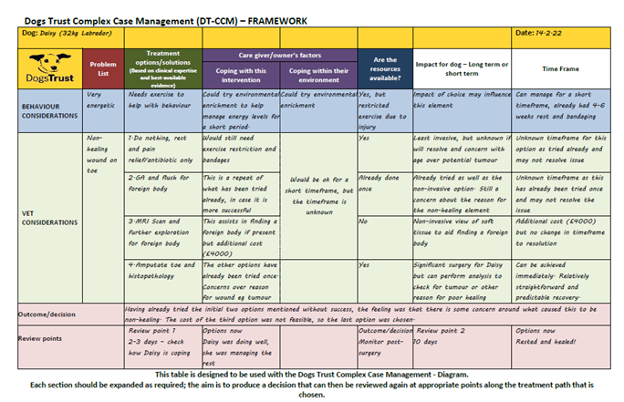 There are many people involved in the care of animals at Dogs Trust. We must consider veterinary surgeons and veterinary nurses, managers and behaviour roles, carers and volunteers who help walk and care for the patients on a daily basis. For more complex cases, specific staff might meet to review and discuss what to do. In order to consider all opinions in the context of an individual animal, Dogs Trust have created a complex case management tool (figure 1, below) which could be adapted as a framework in other settings.4 The tool documents and makes the process clear. It can also outline review points and enable a change in direction to be taken if needed. In addition, the framework offers a way to clearly communicate the decision to others.